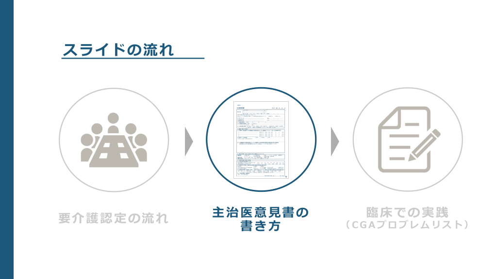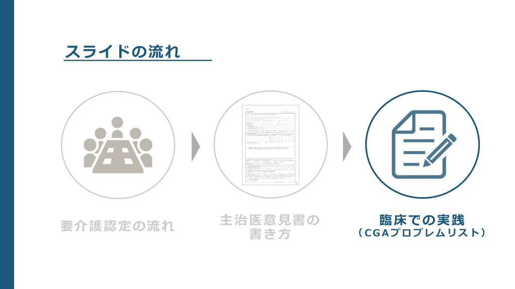 #3. スライドの流れ 要介護認定の流れ 主治医意⾒書の 書き⽅ 臨床での実践 (CGAプロブレムリスト)
