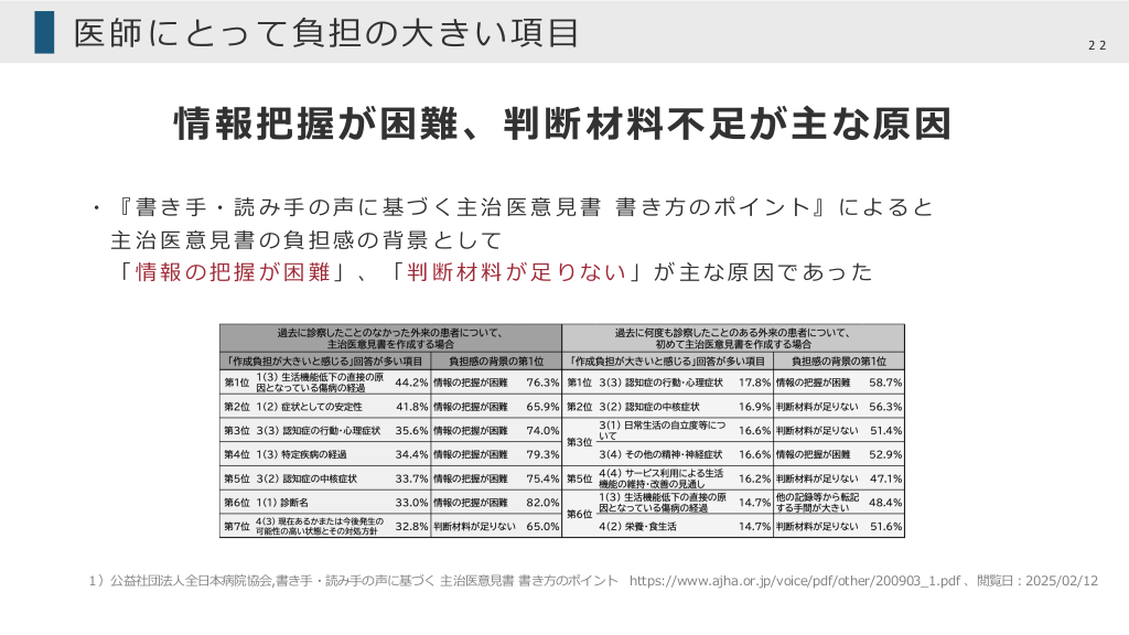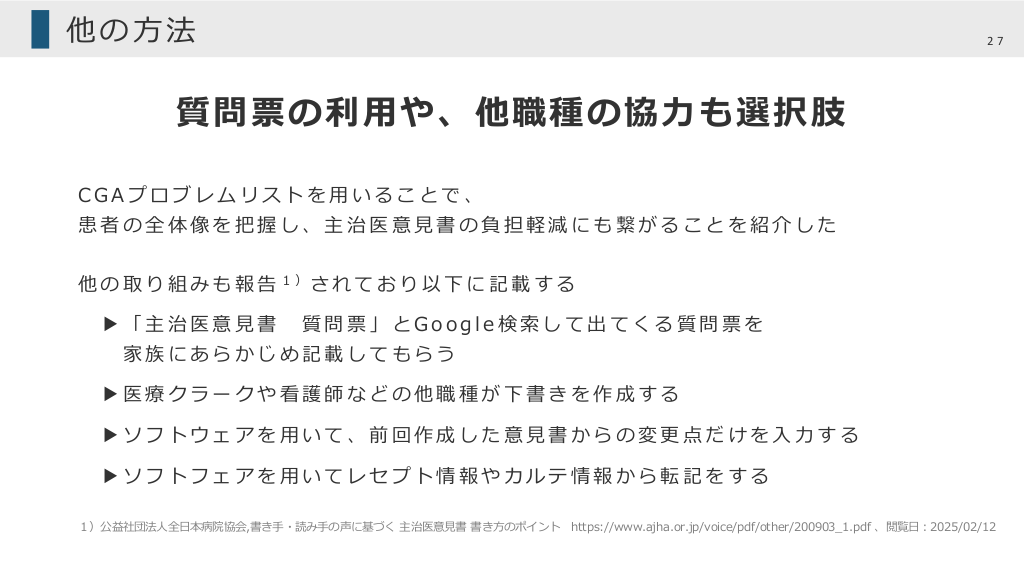 #27. 他の⽅法 27 質問票の利⽤や、他職種の協⼒も選択肢 CGAプロブレムリストを⽤いることで、 患者の全体像を把握し、主治医意⾒書の負担軽減にも繋がることを紹介した 他 の 取 り 組 み も 報 告 1)さ れ て お り 以 下 に 記 載 す る ▶「主治医意⾒書 質問票」とGoogle検索して出てくる質問票を 家族にあらかじめ記載してもらう ▶医療クラークや看護師などの他職種が下書きを作成する ▶ソフトウェアを⽤いて、前回作成した意⾒書からの変更点だけを⼊⼒する ▶ソフトフェアを⽤いてレセプト情報やカルテ情報から転記をする 1)公益社団法⼈全⽇本病院協会,書き⼿・読み⼿の声に基づく 主治医意⾒書 書き⽅のポイント https://www.ajha.or.jp/voice/pdf/other/200903_1.pdf 、閲覧⽇︓2025/02/12