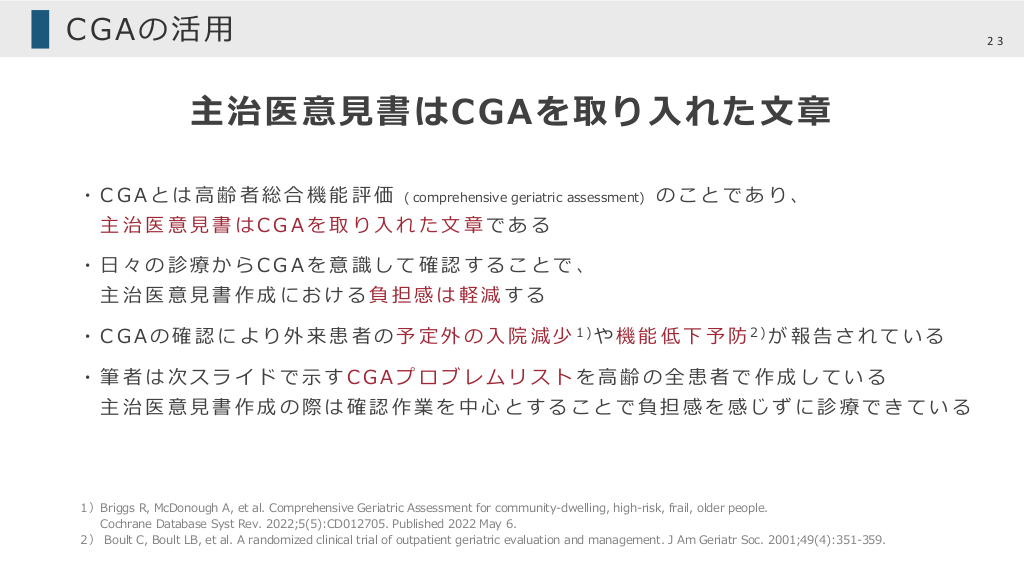#23. CGAの活⽤ 23 主治医意⾒書はCGAを取り⼊れた⽂章 ・CGAとは⾼齢者総合機能評価 ( comprehensive geriatric assessment) のことであり、 主治医意⾒書はCGAを取り⼊れた⽂章である ・⽇々の診療からCGAを意識して確認することで、 主治医意⾒書作成における負担感は軽減する ・ C G A の 確 認 に よ り 外 来 患 者 の 予 定 外 の ⼊ 院 減 少 1)や 機 能 低 下 予 防 2)が 報 告 さ れ て い る ・筆者は次スライドで⽰すCGAプロブレムリストを⾼齢の全患者で作成している 主治医意⾒書作成の際は確認作業を中⼼とすることで負担感を感じずに診療できている 1)Briggs R, McDonough A, et al. Comprehensive Geriatric Assessment for community-dwelling, high-risk, frail, older people. Cochrane Database Syst Rev. 2022;5(5):CD012705. Published 2022 May 6. 2) Boult C, Boult LB, et al. A randomized clinical trial of outpatient geriatric evaluation and management. J Am Geriatr Soc. 2001;49(4):351-359.