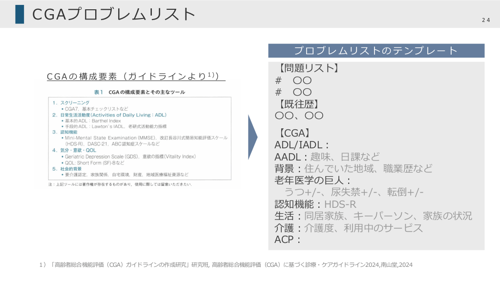 #24. CGAプロブレムリスト 24 プロブレムリストのテンプレート C G A の 構 成 要 素 ( ガ イ ド ラ イ ン よ り 1)) 【問題リスト】 # 〇〇 # 〇〇 【既往歴】 〇〇、〇〇 【CGA】 ADL/IADL︓ AADL︓趣味、⽇課など 背景︓住んでいた地域、職業歴など ⽼年医学の巨⼈︓ うつ+/-、尿失禁+/-、転倒+/認知機能︓HDS-R ⽣活︓同居家族、キーパーソン、家族の状況 介護︓介護度、利⽤中のサービス ACP︓ 1)「⾼齢者総合機能評価(CGA)ガイドラインの作成研究」研究班, ⾼齢者総合機能評価(CGA)に基づく診療・ケアガイドライン2024,南⼭堂,2024