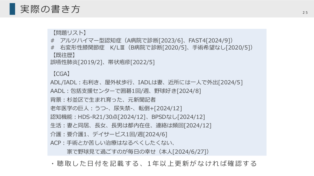 #25. 実際の書き⽅ 【問題リスト】 # アルツハイマー型認知症(A病院で診断[2023/6]、FAST4[2024/9]) # 右変形性膝関節症 K/LⅢ(B病院で診断[2020/5]、⼿術希望なし[2020/5]) 【既往歴】 誤嚥性肺炎[2019/2]、帯状疱疹[2022/5] 【CGA】 ADL/IADL︓右利き、屋外杖歩⾏、IADLは妻、近所には⼀⼈で外出[2024/5] AADL︓包括⽀援センターで囲碁1回/週、野球好き[2024/8] 背景︓杉並区で⽣まれ育った、元新聞記者 ⽼年医学の巨⼈︓うつ-、尿失禁-、転倒+[2024/12] 認知機能︓HDS-R21/30点[2024/12]、BPSDなし[2024/12] ⽣活︓妻と同居、⻑⼥、⻑男は都内在住、連絡は頻回[2024/12] 介護︓要介護1、デイサービス1回/週[2024/6] ACP︓⼿術とか苦しい治療はなるべくしたくない、 家で野球⾒て過ごすのが毎⽇の幸せ(本⼈[2024/6/27]) ・聴取した⽇付を記載する、1年以上更新がなければ確認する 25