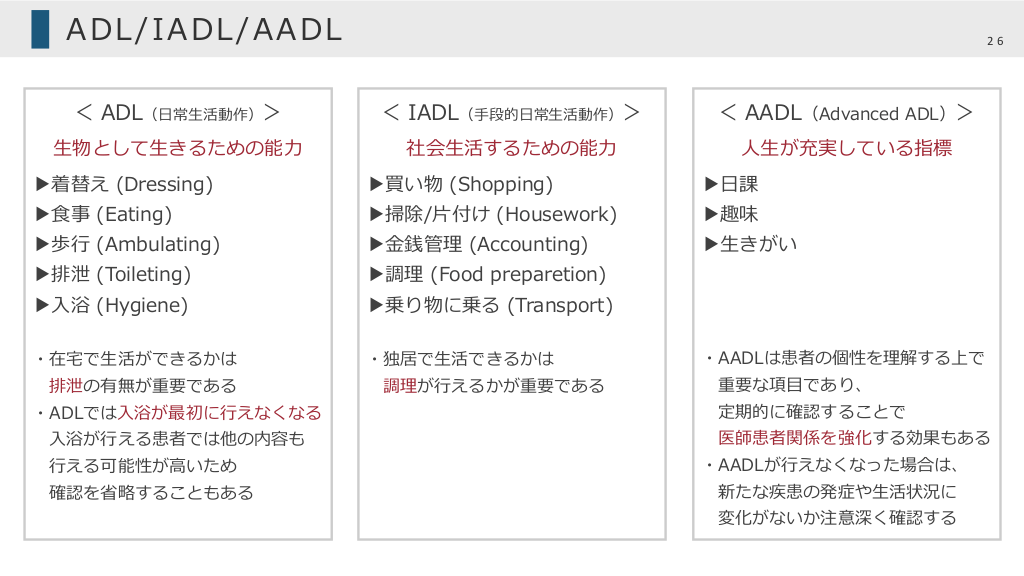 #26. ADL/IADL/AADL 26 < ADL(⽇常⽣活動作)> < IADL(⼿段的⽇常⽣活動作)> < AADL(Advanced ADL)> ⽣物として⽣きるための能⼒ 社会⽣活するための能⼒ ⼈⽣が充実している指標 ▶着替え (Dressing) ▶買い物 (Shopping) ▶⽇課 ▶⾷事 (Eating) ▶掃除/⽚付け (Housework) ▶趣味 ▶歩⾏ (Ambulating) ▶⾦銭管理 (Accounting) ▶⽣きがい ▶排泄 (Toileting) ▶調理 (Food preparetion) ▶⼊浴 (Hygiene) ▶乗り物に乗る (Transport) ・在宅で⽣活ができるかは ・独居で⽣活できるかは 排泄の有無が重要である ・ADLでは⼊浴が最初に⾏えなくなる ⼊浴が⾏える患者では他の内容も ⾏える可能性が⾼いため 確認を省略することもある 調理が⾏えるかが重要である ・AADLは患者の個性を理解する上で 重要な項⽬であり、 定期的に確認することで 医師患者関係を強化する効果もある ・AADLが⾏えなくなった場合は、 新たな疾患の発症や⽣活状況に 変化がないか注意深く確認する