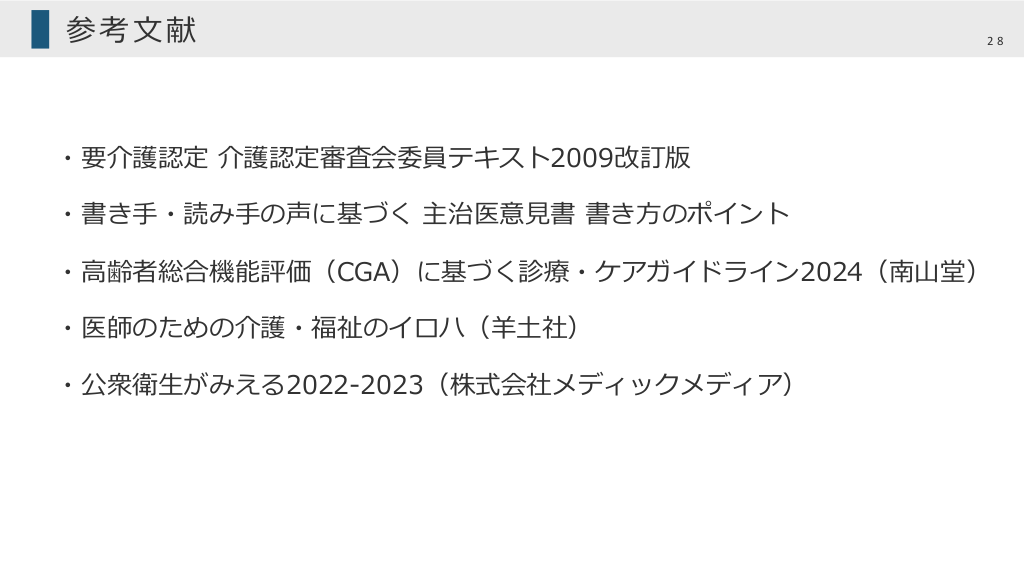 #28. 参考⽂献 28 ・要介護認定 介護認定審査会委員テキスト2009改訂版 ・書き⼿・読み⼿の声に基づく 主治医意⾒書 書き⽅のポイント ・⾼齢者総合機能評価(CGA)に基づく診療・ケアガイドライン2024(南⼭堂) ・医師のための介護・福祉のイロハ(⽺⼟社) ・公衆衛⽣がみえる2022-2023(株式会社メディックメディア)