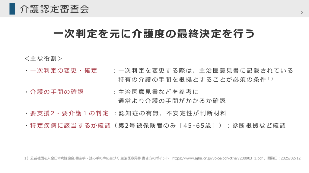 #5. 介護認定審査会 5 ⼀次判定を元に介護度の最終決定を⾏う <主な役割> ・⼀次判定の変更・確定 ︓⼀次判定を変更する際は、主治医意⾒書に記載されている 特 有 の 介 護 の ⼿ 間 を 根 拠 と す る こ と が 必 須 の 条 件 1) ・介護の⼿間の確認 ︓主治医意⾒書などを参考に 通常より介護の⼿間がかかるか確認 ・要⽀援2・要介護1の判定 ︓認知症の有無、不安定性が判断材料 ・特定疾病に該当するか確認(第2号被保険者のみ[45-65歳])︓診断根拠など確認 1)公益社団法⼈全⽇本病院協会,書き⼿・読み⼿の声に基づく 主治医意⾒書 書き⽅のポイント https://www.ajha.or.jp/voice/pdf/other/200903_1.pdf 、閲覧⽇︓2025/02/12