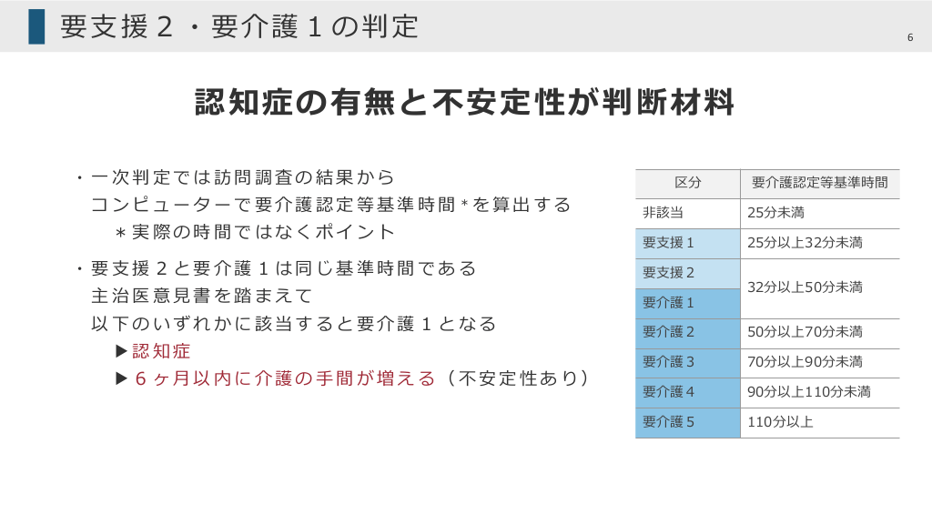 #6. 要⽀援2・要介護1の判定 6 認知症の有無と不安定性が判断材料 ・⼀次判定では訪問調査の結果から コ ン ピ ュ ー タ ー で 要 介 護 認 定 等 基 準 時 間 *を 算 出 す る *実際の時間ではなくポイント ・要⽀援2と要介護1は同じ基準時間である 主治医意⾒書を踏まえて 以下のいずれかに該当すると要介護1となる ▶認知症 ▶6ヶ⽉以内に介護の⼿間が増える(不安定性あり) 区分 要介護認定等基準時間 ⾮該当 25分未満 要⽀援1 25分以上32分未満 要⽀援2 要介護1 32分以上50分未満 要介護2 50分以上70分未満 要介護3 70分以上90分未満 要介護4 90分以上110分未満 要介護5 110分以上