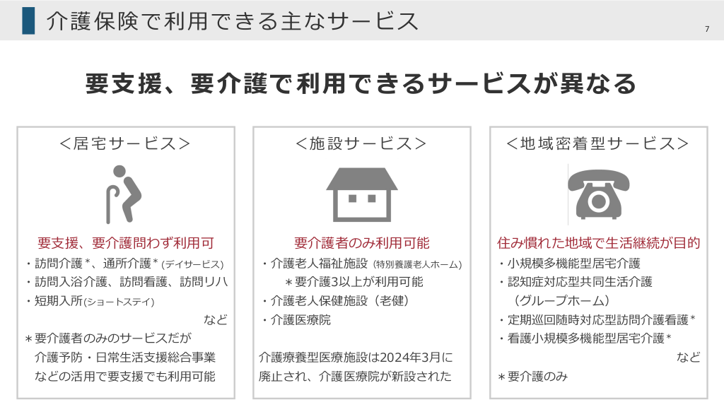 #7. 介護保険で利⽤できる主なサービス 7 要⽀援、要介護で利⽤できるサービスが異なる <居宅サービス> <施設サービス> <地域密着型サービス> 要⽀援、要介護問わず利⽤可 要介護者のみ利⽤可能 住み慣れた地域で⽣活継続が⽬的 ・訪問介護*、通所介護* (デイサービス) ・介護⽼⼈福祉施設(特別養護⽼⼈ホーム) ・訪問⼊浴介護、訪問看護、訪問リハ ・短期⼊所(ショートステイ) *要介護3以上が利⽤可能 ・介護⽼⼈保健施設(⽼健) など ・介護医療院 *要介護者のみのサービスだが ・⼩規模多機能型居宅介護 ・認知症対応型共同⽣活介護 (グループホーム) ・定期巡回随時対応型訪問介護看護* ・看護⼩規模多機能型居宅介護* 介護予防・⽇常⽣活⽀援総合事業 介護療養型医療施設は2024年3⽉に などの活⽤で要⽀援でも利⽤可能 廃⽌され、介護医療院が新設された など *要介護のみ