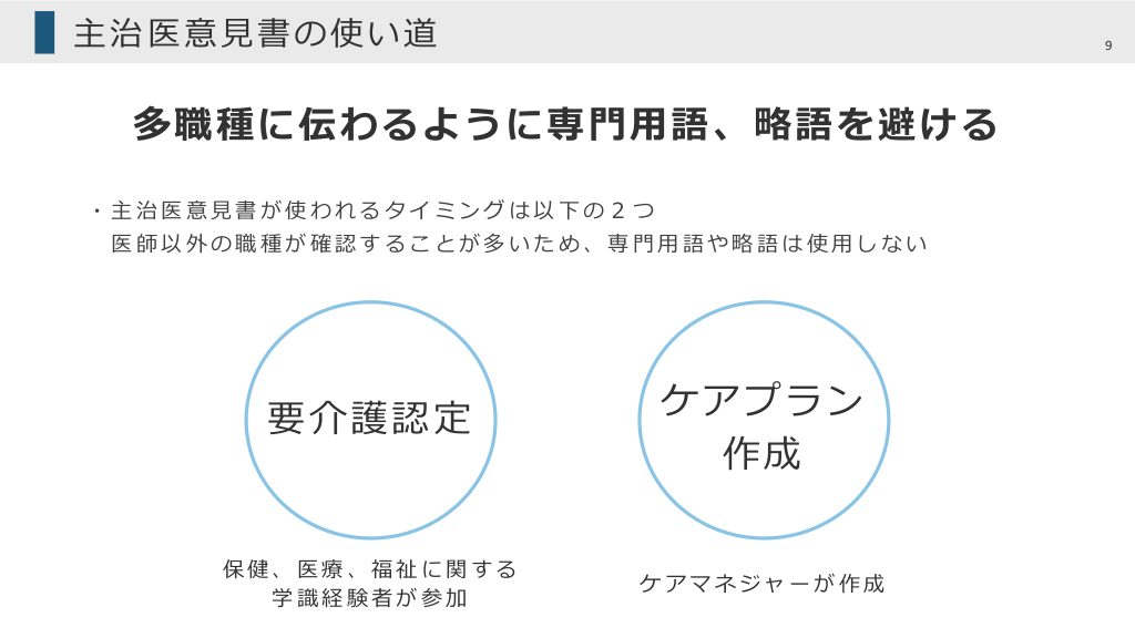 #9. 主治医意⾒書の使い道 9 多職種に伝わるように専⾨⽤語、略語を避ける ・主治医意⾒書が使われるタイミングは以下の2つ 医師以外の職種が確認することが多いため、専⾨⽤語や略語は使⽤しない 要介護認定 ケアプラン 作成 保健、医療、福祉に関する 学識経験者が参加 ケアマネジャーが作成