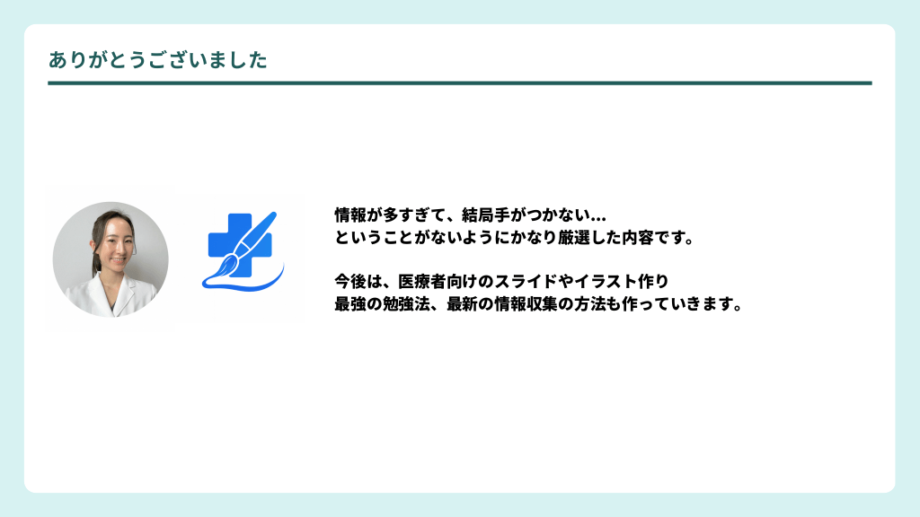 #10. ありがとうございました 情報が多すぎて、結局手がつかない... ということがないようにかなり厳選した内容です。 今後は、医療者向けのスライドやイラスト作り 最強の勉強法、最新の情報収集の方法も作っていきます。