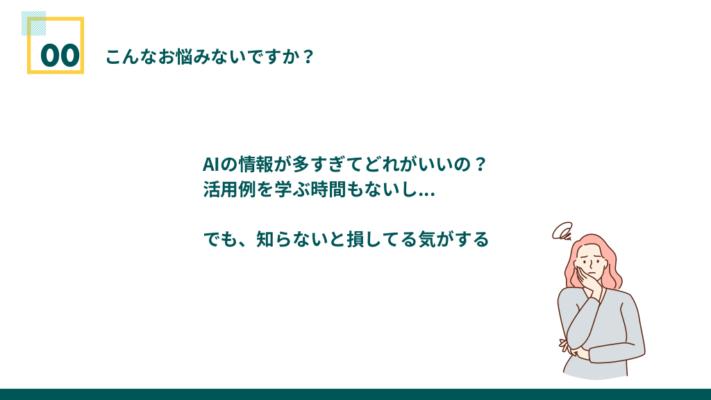 #2. 00 こんなお悩みないですか? AIの情報が多すぎてどれがいいの? 活用例を学ぶ時間もないし... でも、知らないと損してる気がする