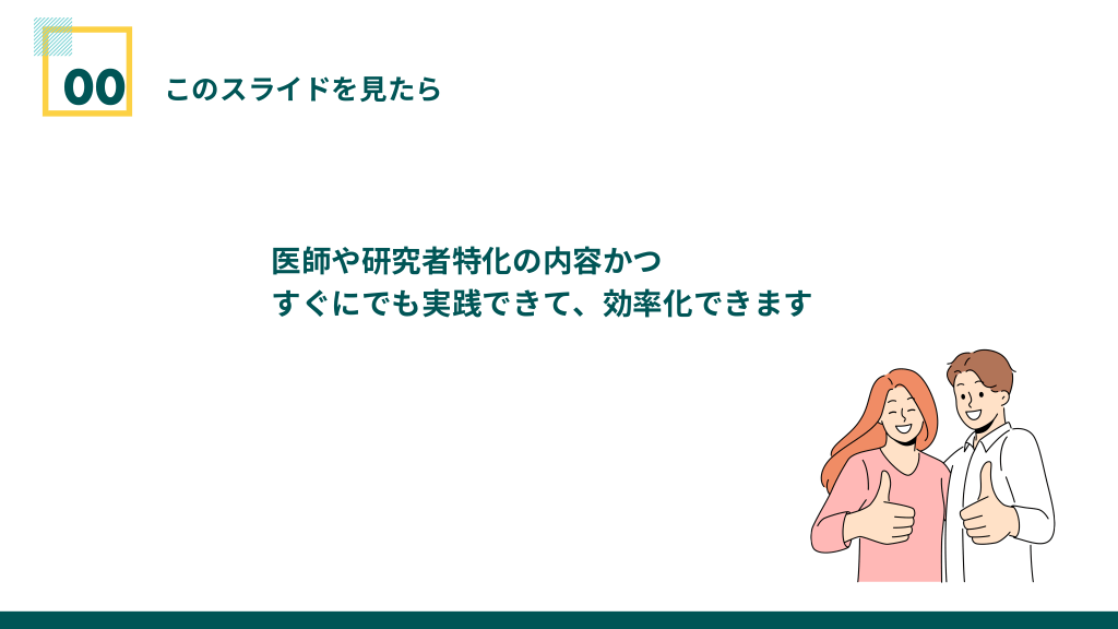 #3. 00 このスライドを見たら 医師や研究者特化の内容かつ すぐにでも実践できて、効率化できます