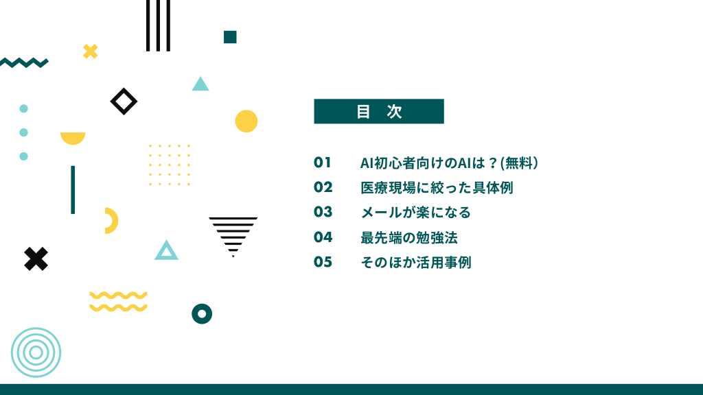 #4. 目 次 01 AI初心者向けのAIは?(無料) 02 医療現場に絞った具体例 03 メールが楽になる 04 最先端の勉強法 05 そのほか活用事例