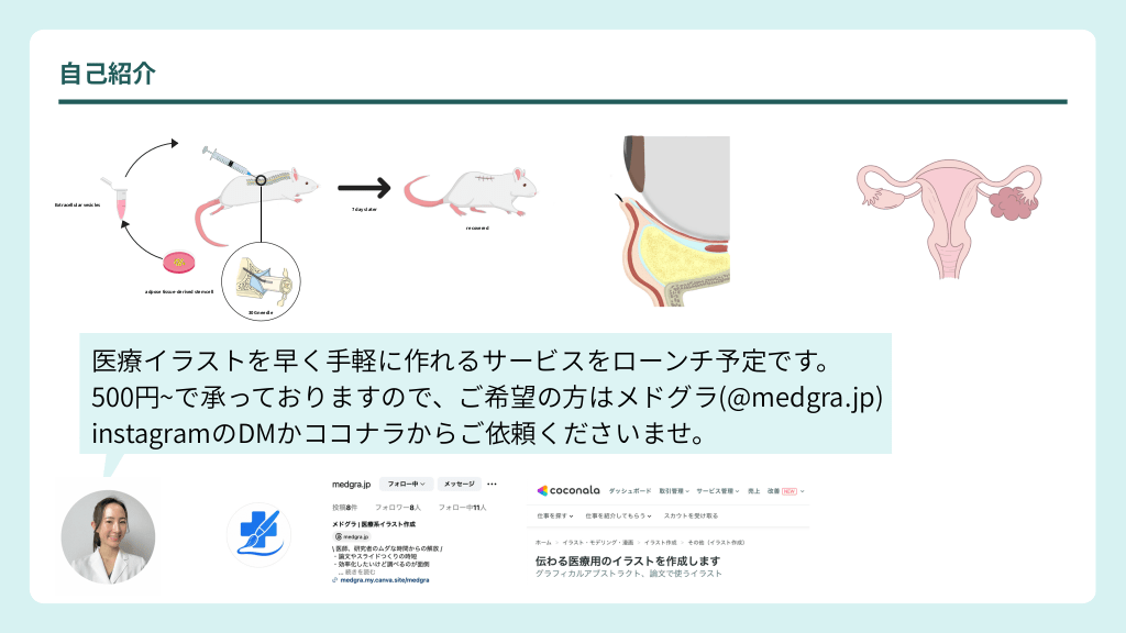 #5. 自己紹介 Extracellular vesicles 7 days later recovered adpose tissue-derived stem cell 30G needle 医療イラストを早く手軽に作れるサービスをローンチ予定です。 500円~で承っておりますので、ご希望の方はメドグラ(@medgra.jp) instagramのDMかココナラからご依頼くださいませ。