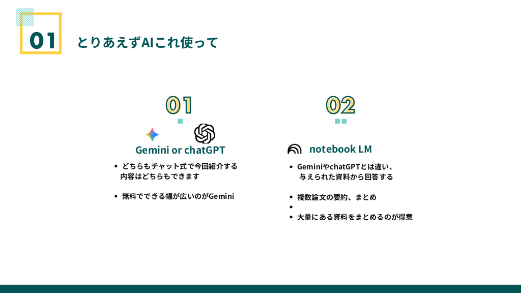#6. 01 とりあえずAIこれ使って 01 02 Gemini or chatGPT notebook LM どちらもチャット式で今回紹介する 内容はどちらもできます GeminiやchatGPTとは違い、 与えられた資料から回答する 無料でできる幅が広いのがGemini 複数論文の要約、まとめ 大量にある資料をまとめるのが得意