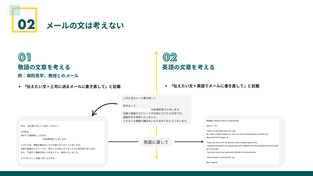 #7. 02 メールの文は考えない 01 敬語の文章を考える 02 英語の文章を考える 例:病院見学、教授とのメール 「伝えたい文+上司に送るメールに書き直して」と記載 「伝えたい文+英語でメールに書き直して」と記載