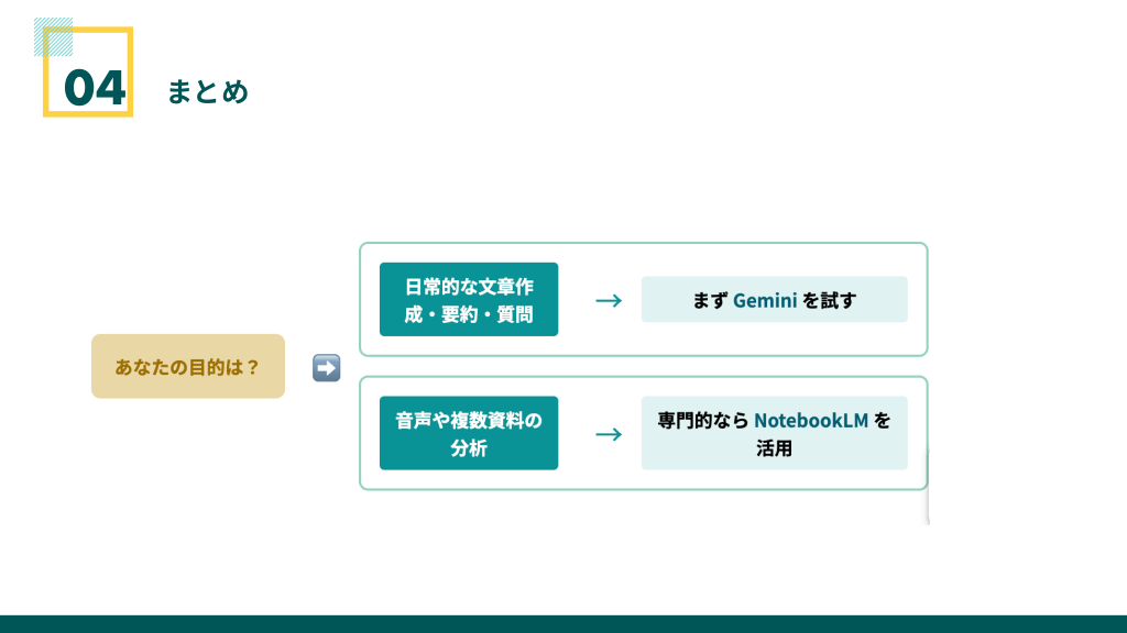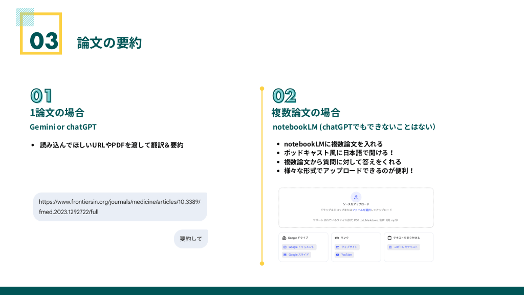#8. 03 論文の要約 01 02 1論文の場合 複数論文の場合 Gemini or chatGPT notebookLM (chatGPTでもできないことはない) 読み込んでほしいURLやPDFを渡して翻訳&要約 notebookLMに複数論文を入れる ポッドキャスト風に日本語で聞ける! 複数論文から質問に対して答えをくれる 様々な形式でアップロードできるのが便利!