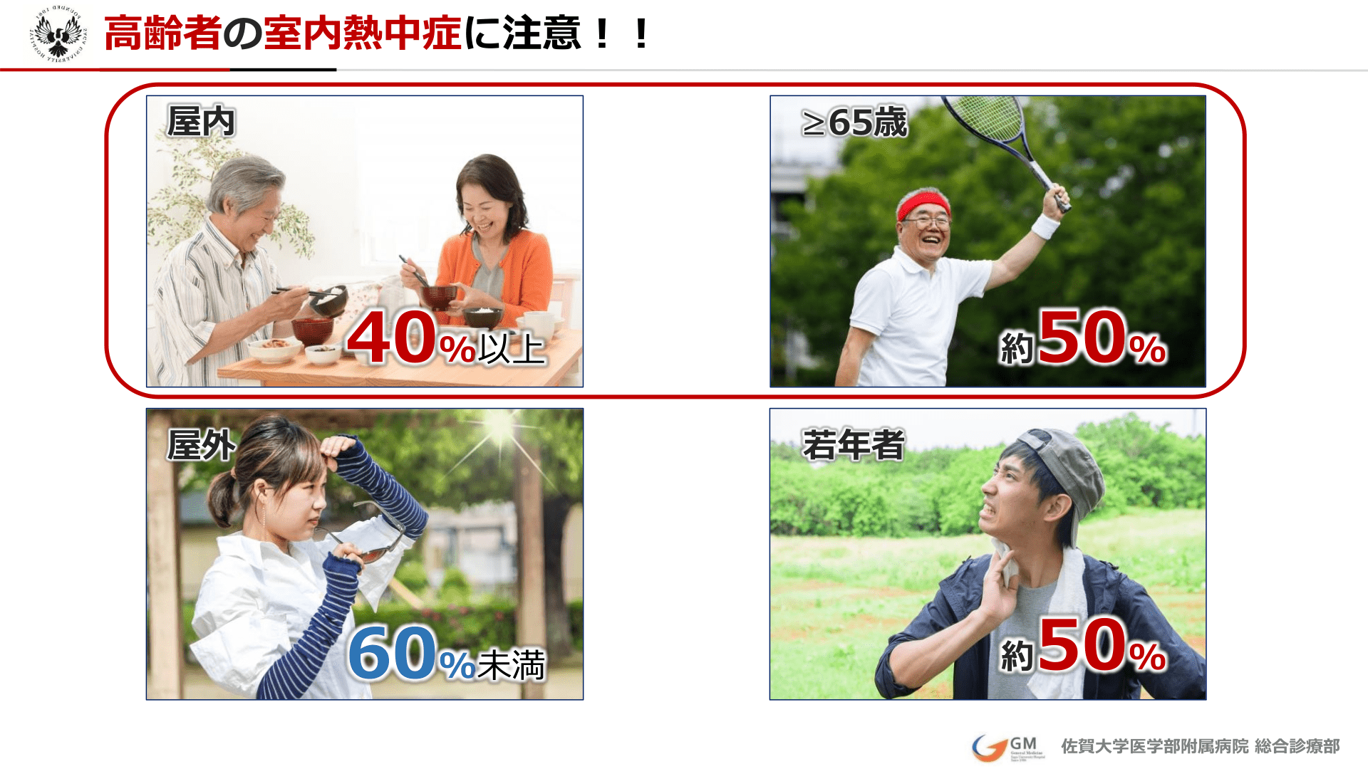 一般に熱中症は屋外で発症するというイメージが多いですが、熱中症の40%以上は屋内で発症しています。