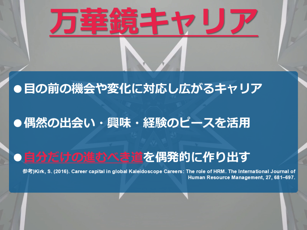 参考)Kirk, S. (2016). Career capital in global Kaleidoscope Careers: The role of HRM. The International Journal of Human Resource Management, 27, 681–697.
