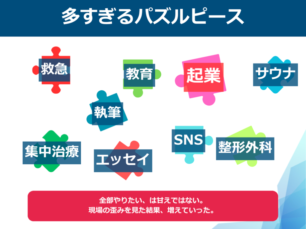 #22. ×救急? ×教育? ×執筆? ×集中治療? ×SNS発信? ×整形外科? ×エッセイスト? ×サウナスパ? 多すぎるパズルピースを万華鏡に