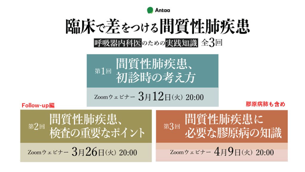 「間質性肺疾患」については、呼吸器内科専門であっても苦手意識のある医師も多い中、見逃すと致死的経過を辿る症例もあり、抗線維化薬の登場とあいまって、近年注目を集めている疾患です。