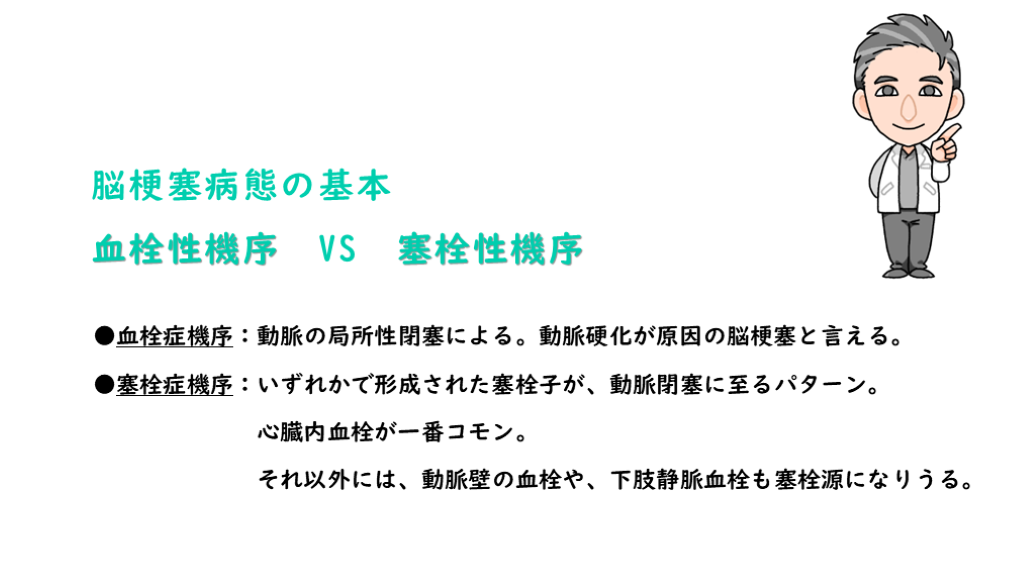 血栓性機序 VS 塞栓性機序 ●血栓症機序:動脈の局所性閉塞による。動脈硬化が原因の脳梗塞と言える。