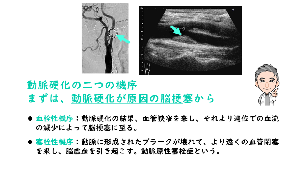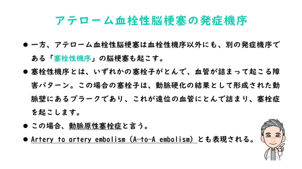 塞栓性機序:動脈に形成されたプラークが壊れて、より遠くの血管閉塞を来し、脳虚血を引き起こす。動脈原性塞栓症という。