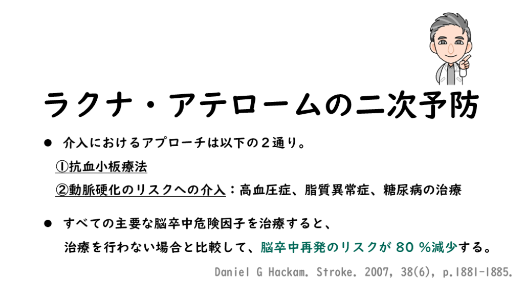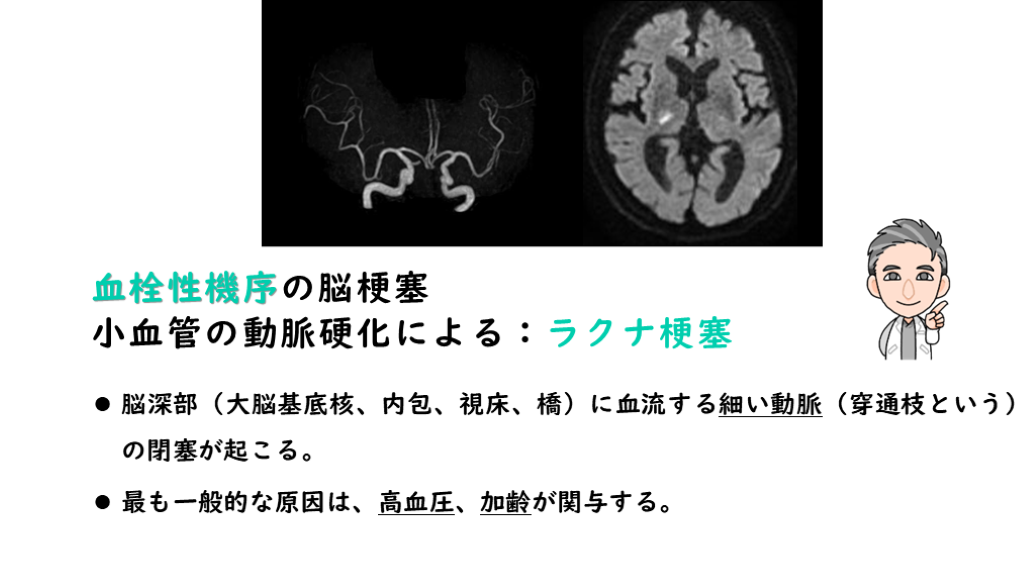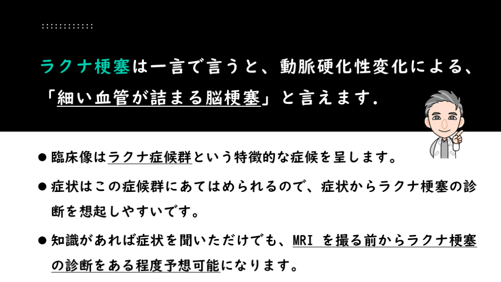 知識があれば症状を聞いただけでも、MRI を撮る前からラクナ梗塞の診断をある程度予想可能になります。 ラクナ梗塞は一言で言うと、動脈硬化性変化による、