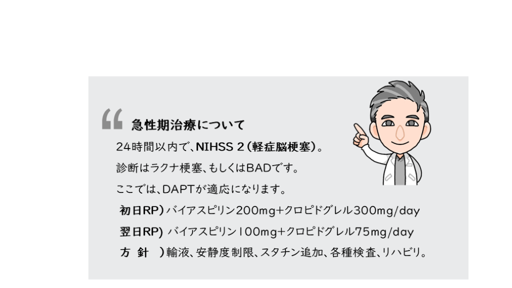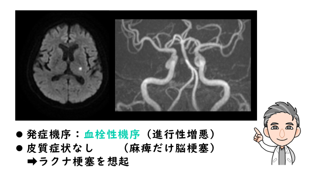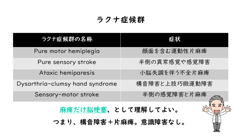 つまり、構音障害+片麻痺。意識障害なし。 ラクナ症候群
