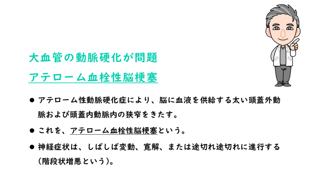 アテローム血栓性脳梗塞は、血栓性機序の脳梗塞をきたす。