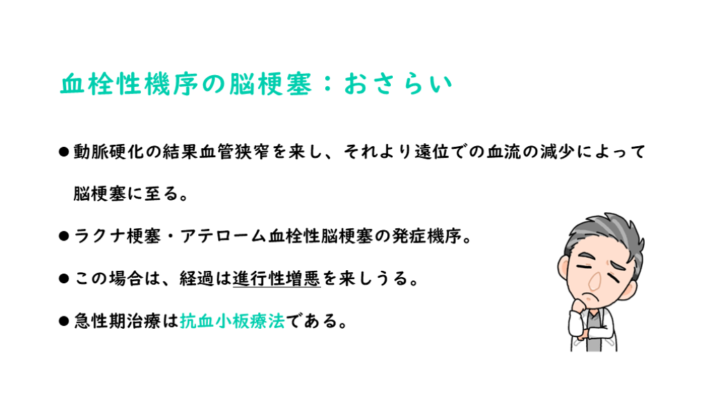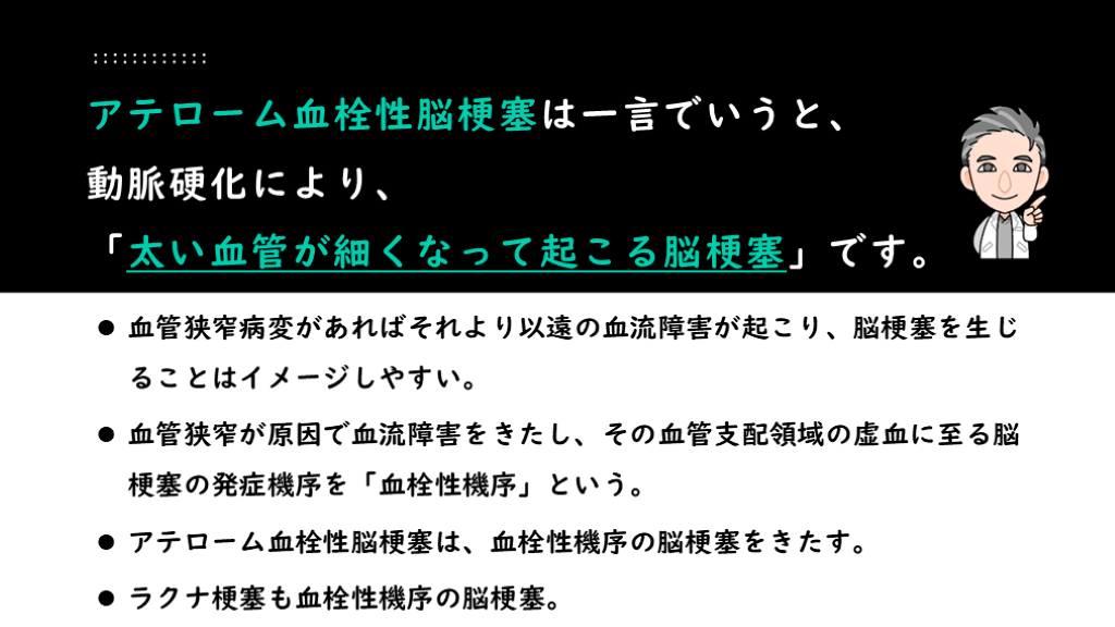 ラクナ梗塞も血栓性機序の脳梗塞。 アテローム血栓性脳梗塞は一言でいうと、