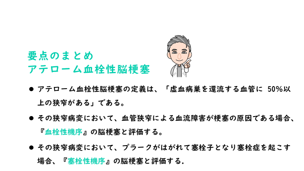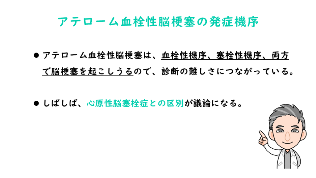 アテローム血栓性脳梗塞は、血栓性機序、塞栓性機序、両方で脳梗塞を起こしうるので、診断の難しさにつながっている。
