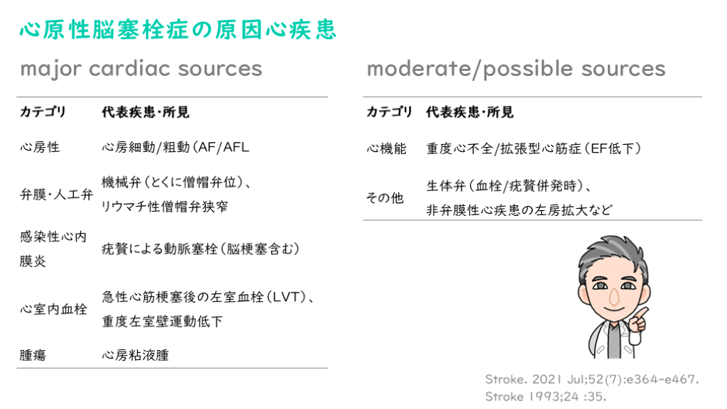 心原性脳塞栓症の原因心疾患 Stroke. 2021 Jul;52(7):e364-e467. Stroke 1993;24 :35.