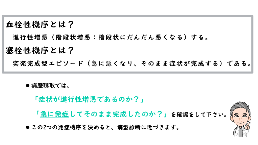 突発完成型エピソード(急に悪くなり、そのまま症状が完成する)である。 病歴聴取では、