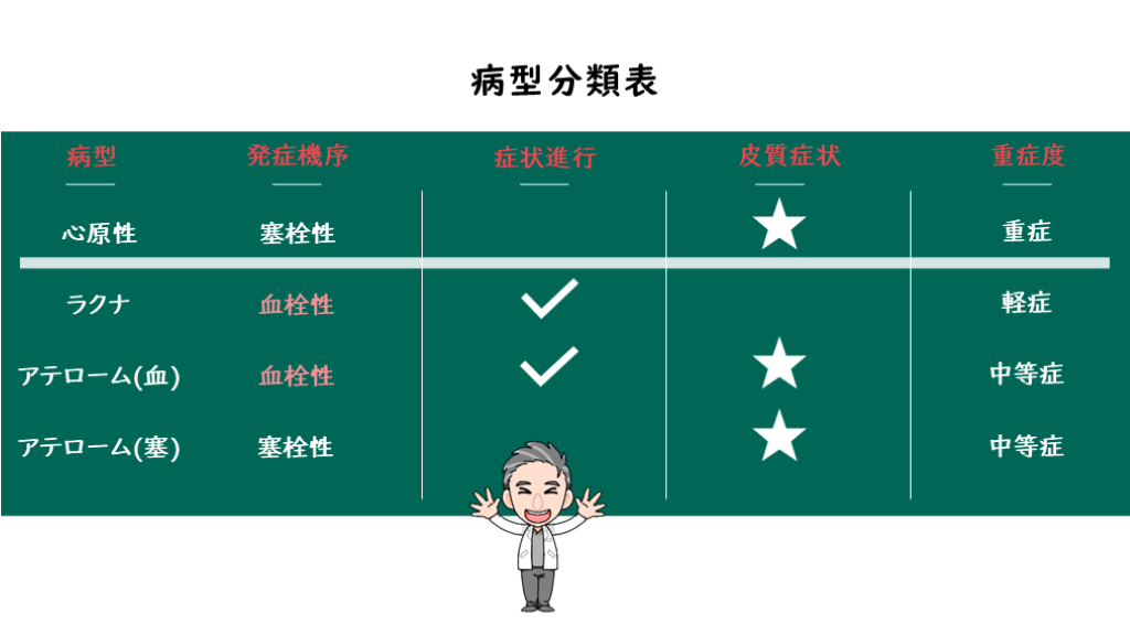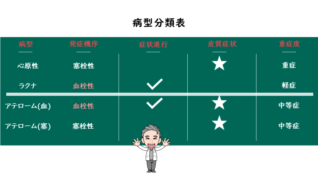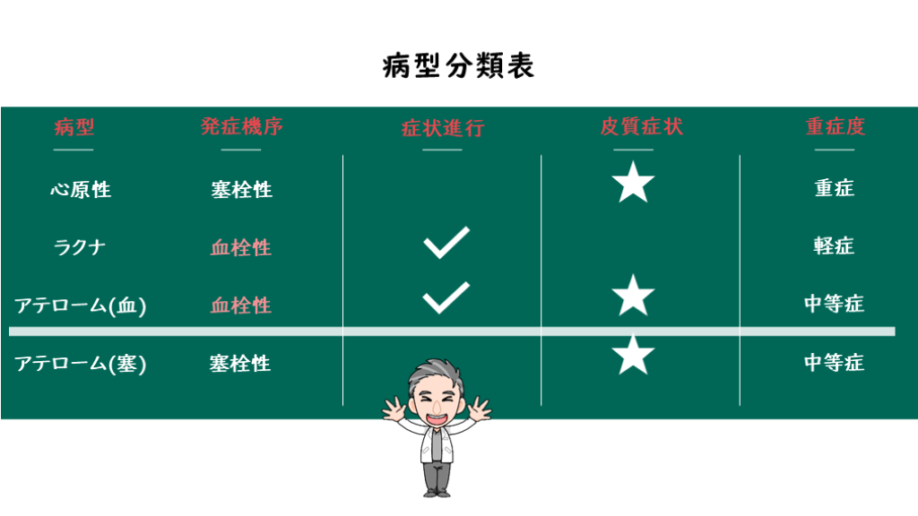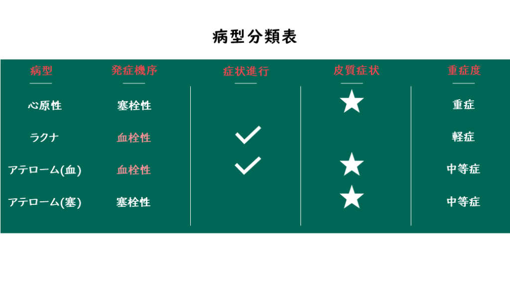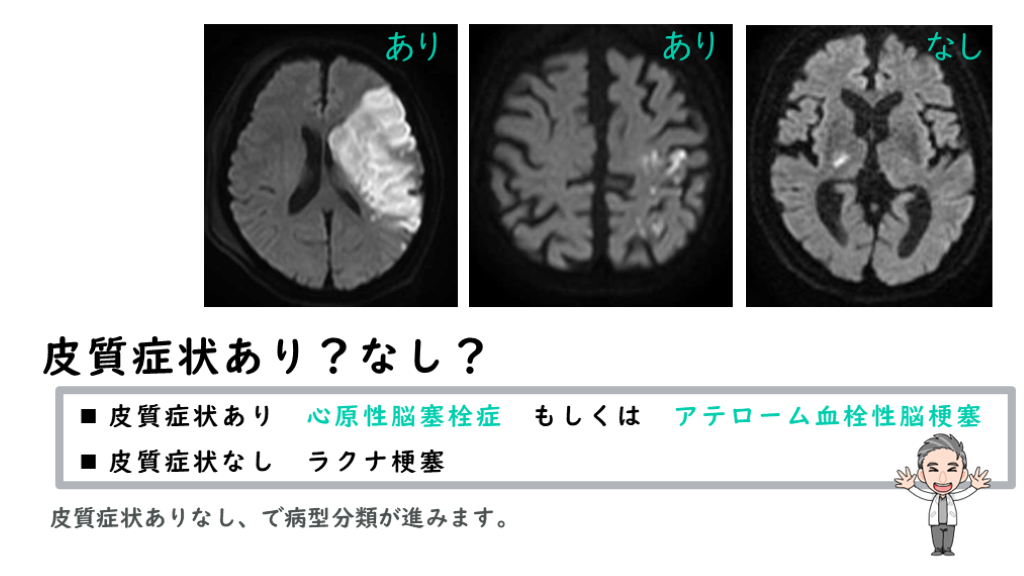 皮質症状なし ラクナ梗塞 皮質症状ありなし、で病型分類が進みます。 あり あり なし