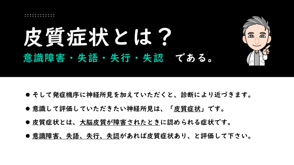 意識して評価していただきたい神経所見は、「皮質症状」です。