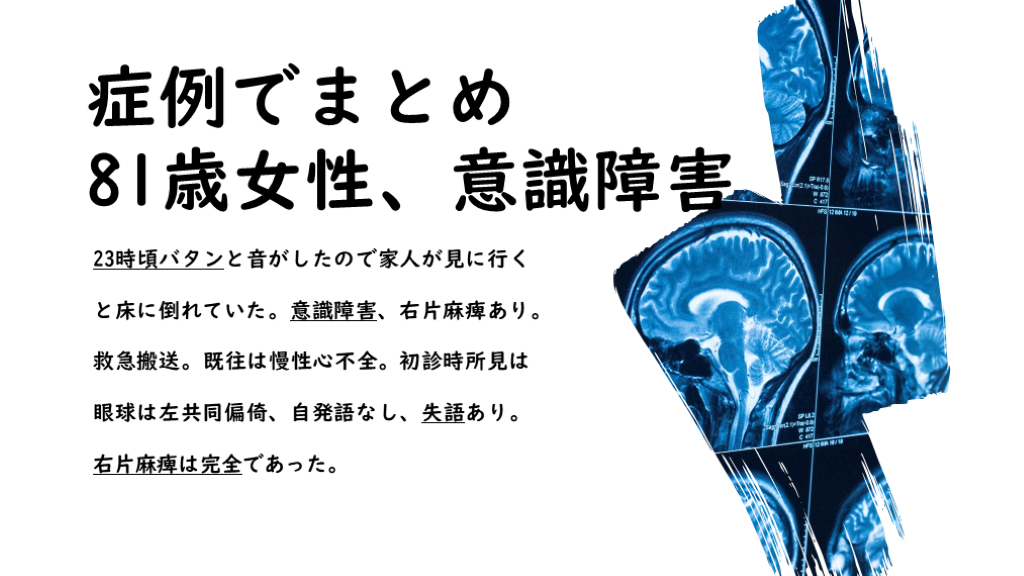 #28. 23時頃バタンと音がしたので家人が見に行くと床に倒れていた。意識障害、右片麻痺あり。救急搬送。既往は慢性心不全。初診時所見は眼球は左共同偏倚、自発語なし、失語あり。右片麻痺は完全であった。