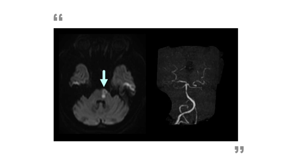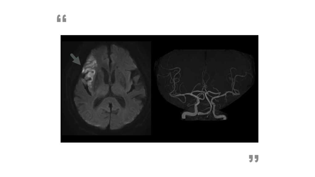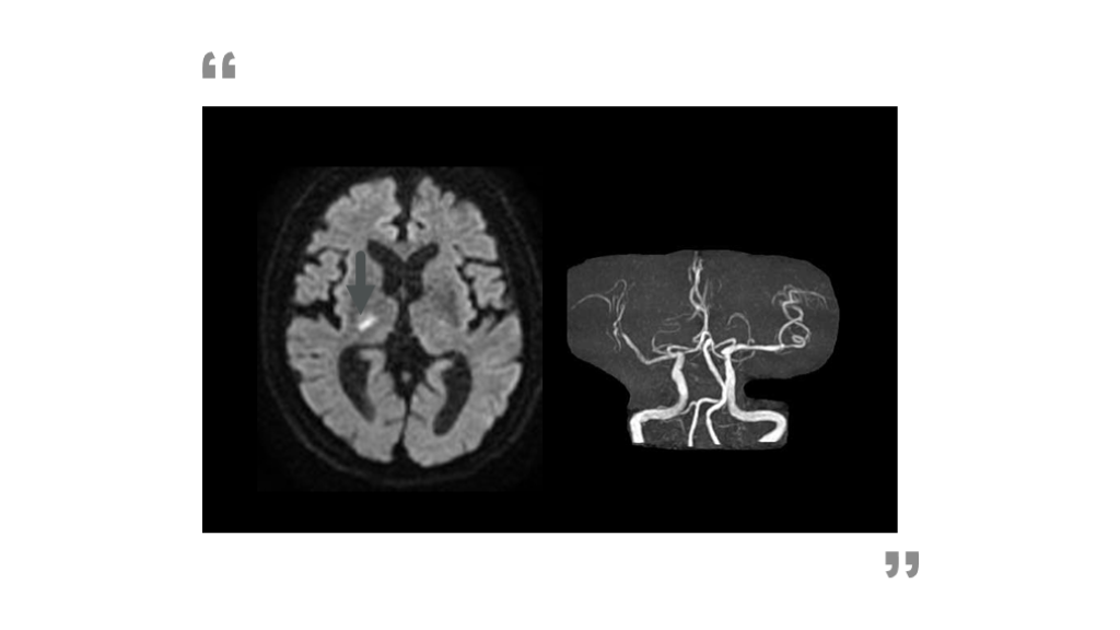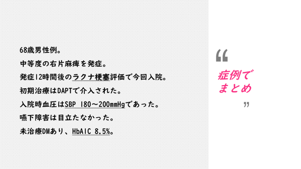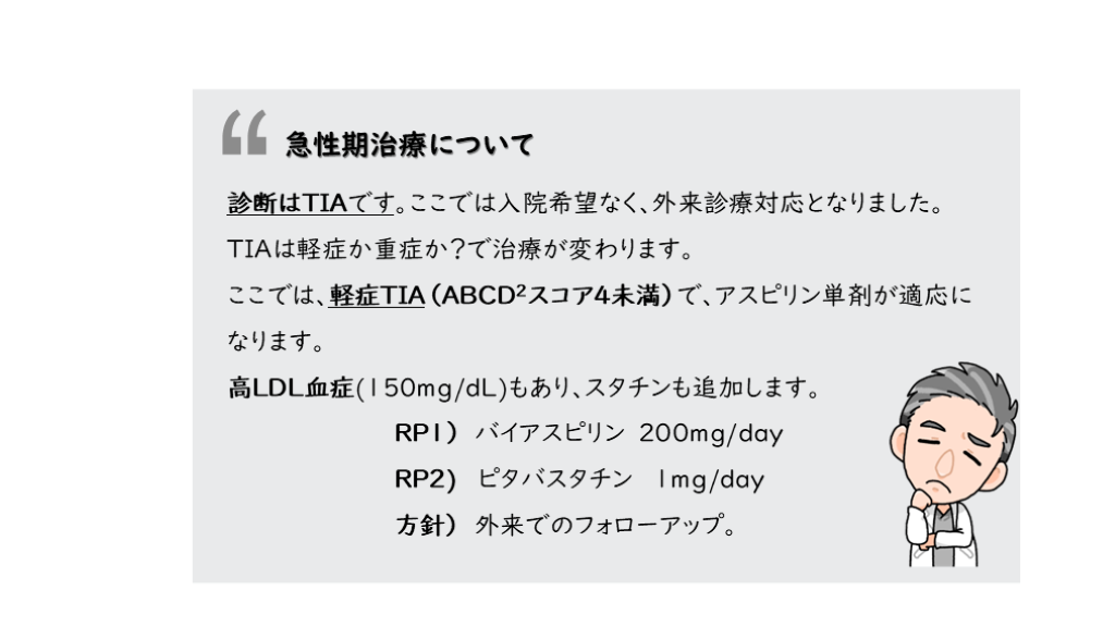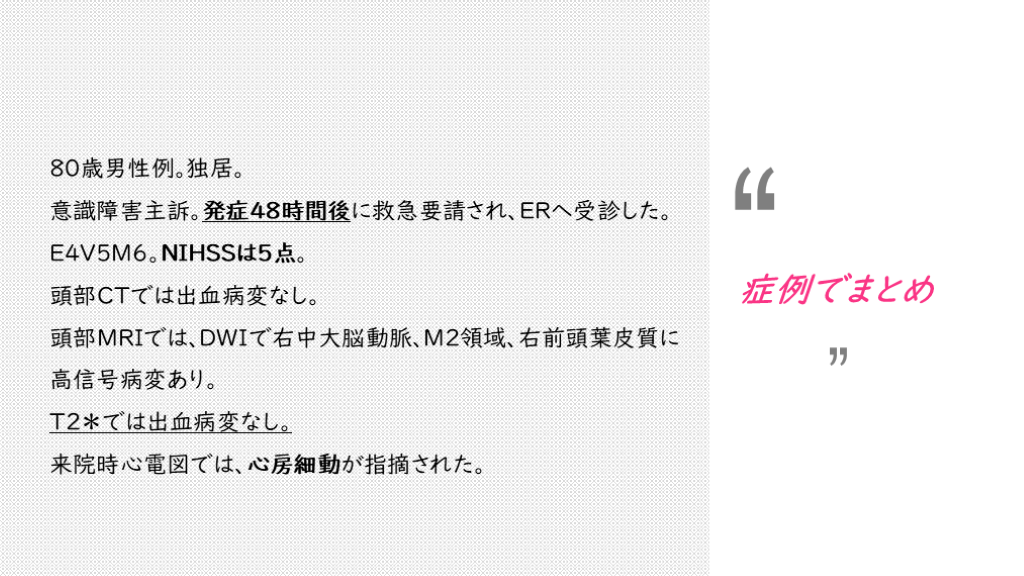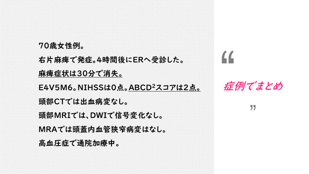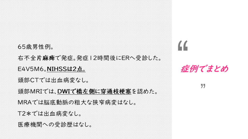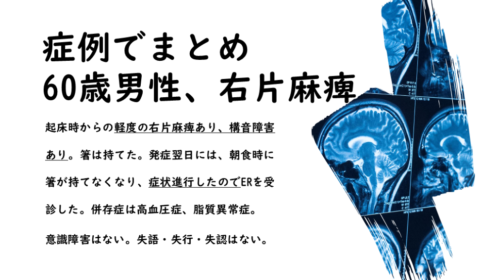 #31. 起床時からの軽度の右片麻痺あり、構音障害あり。箸は持てた。発症翌日には、朝食時に箸が持てなくなり、症状進行したのでERを受診した。併存症は高血圧症、脂質異常症。