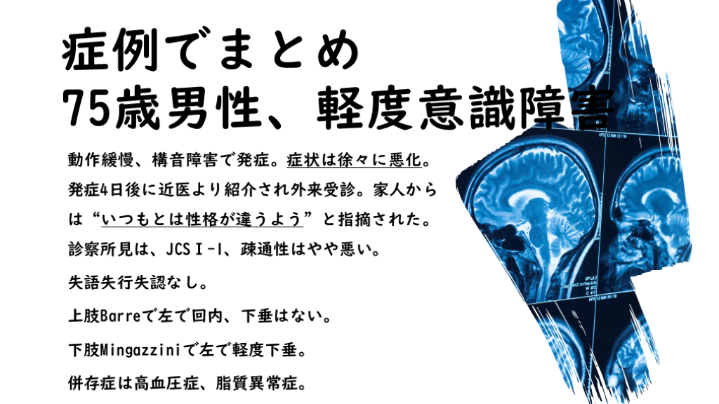 #34. 動作緩慢、構音障害で発症。症状は徐々に悪化。発症4日後に近医より紹介され外来受診。家人からは“いつもとは性格が違うよう”と指摘された。診察所見は、JCSⅠ-1、疎通性はやや悪い。