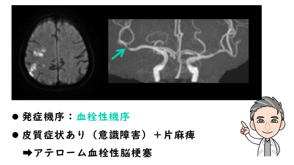 その狭窄病変において、血管狭窄による血流障害が梗塞の原因である場合、『血栓性機序』の脳梗塞と評価する。