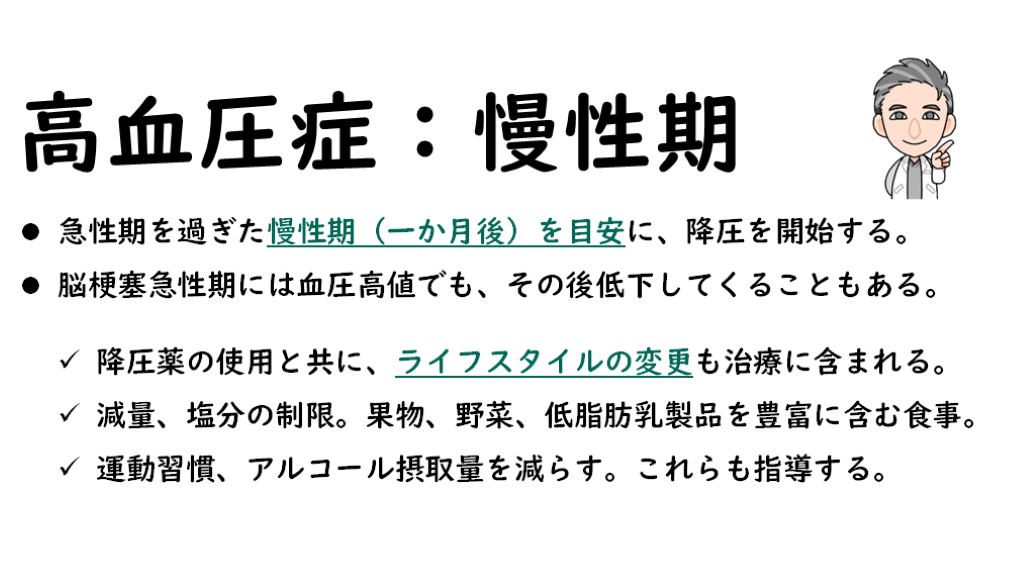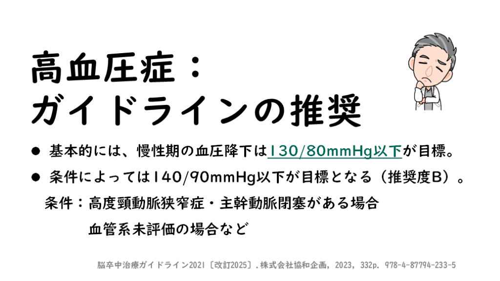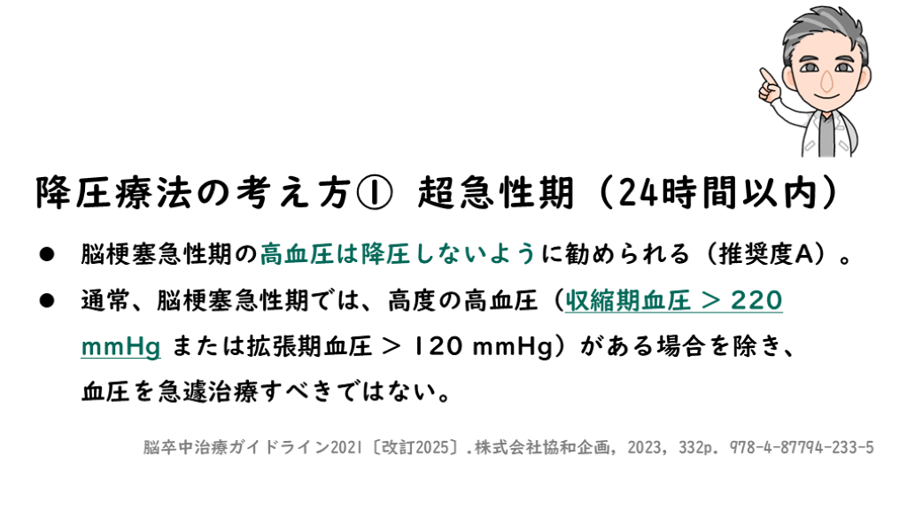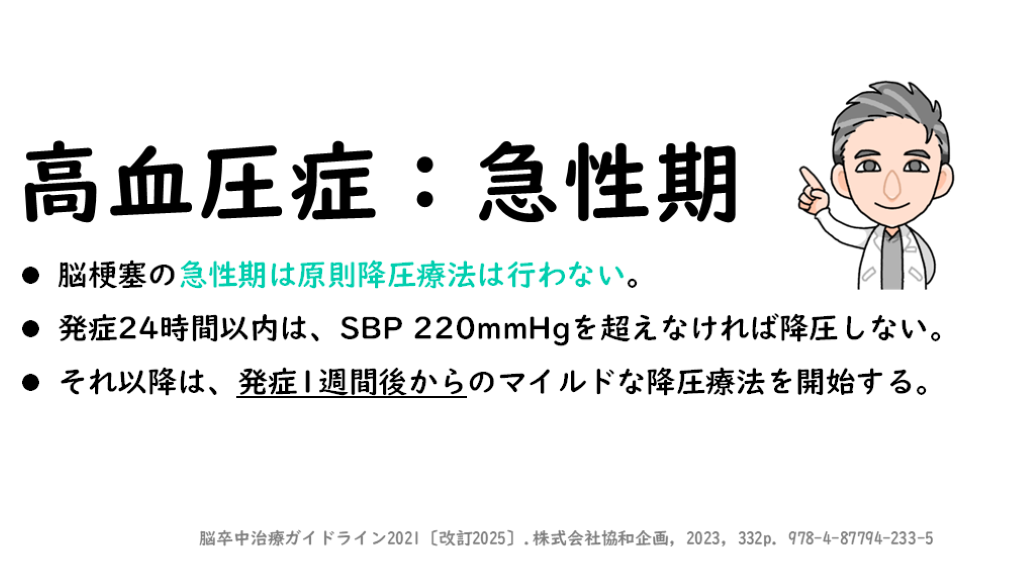 通常、脳梗塞急性期では、高度の高血圧(収縮期血圧 > 220 mmHg または拡張期血圧 > 120 mmHg)がある場合を除き、 血圧を急遽治療すべきではない。