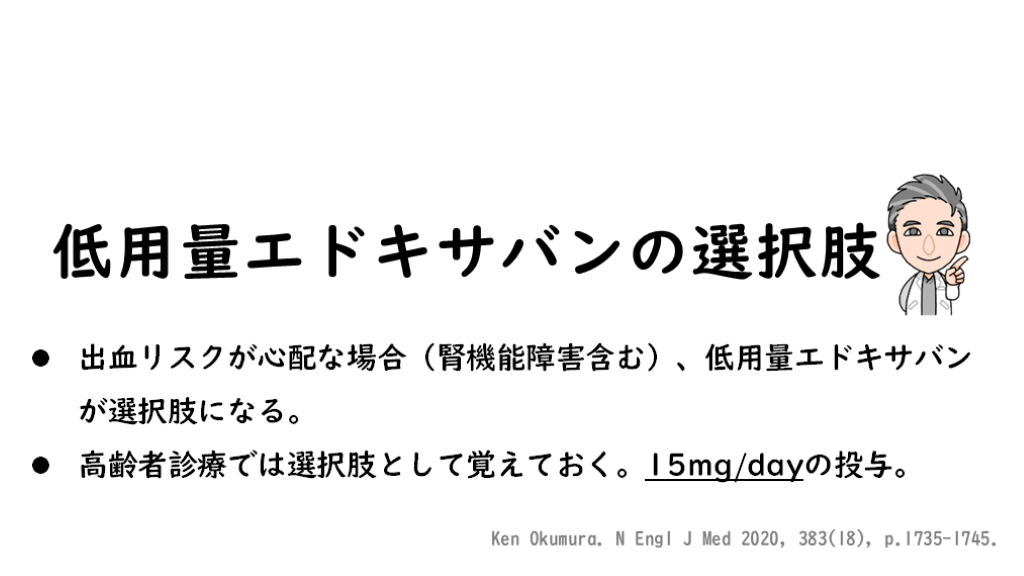 #114. 低用量エドキサバンの選択肢 出血リスクが心配な場合(腎機能障害含む)、低用量エドキサバンが選択肢になる。