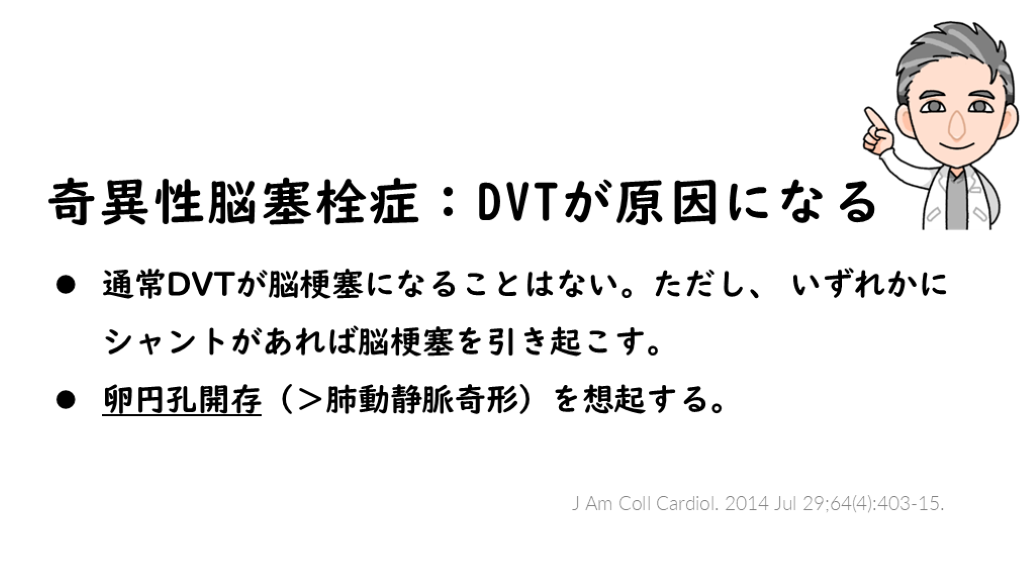#118. 奇異性脳塞栓症:DVTが原因になる 通常DVTが脳梗塞になることはない。ただし、 いずれかにシャントがあれば脳梗塞を引き起こす。