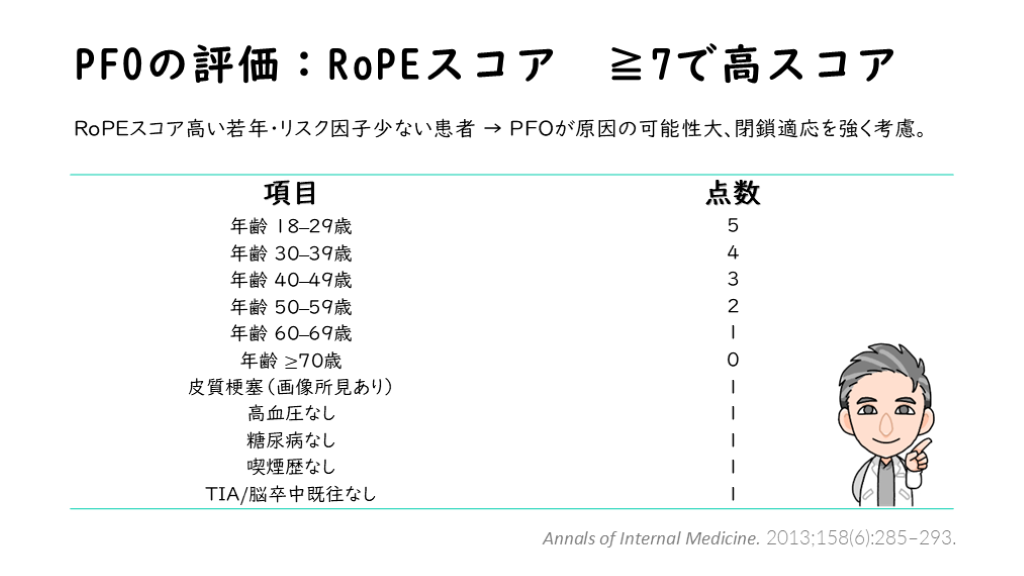 #120. PFOの評価:RoPEスコア ≧7で高スコア RoPEスコア高い若年・リスク因子少ない患者 → PFOが原因の可能性大、閉鎖適応を強く考慮。 Annals of Internal Medicine. 2013;158(6):285–293.