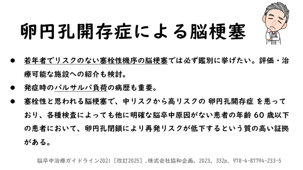 塞栓性と思われる脳梗塞で、中リスクから高リスクの 卵円孔開存症 を患っており、各種検査によっても他に明確な脳卒中原因がない患者の年齢 60 歳以下の患者において、卵円孔閉鎖により再発リスクが低下するという質の高い証拠がある。 脳卒中治療ガイドライン2021〔改訂2025〕.株式会社協和企画, 2023, 332p. 978-4-87794-233-5