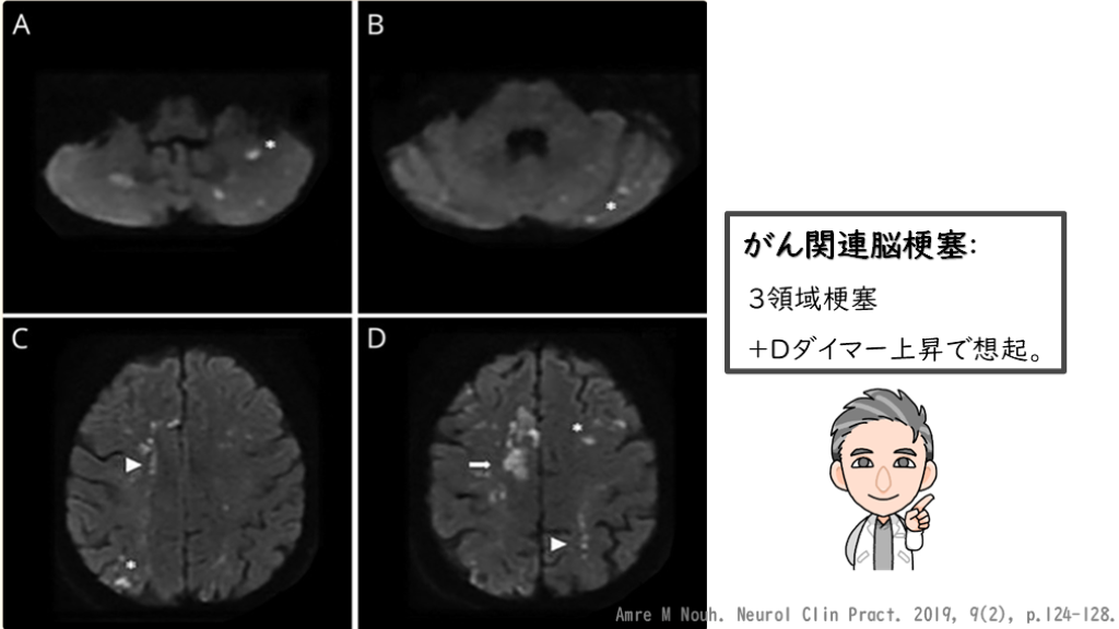 +Dダイマー上昇で想起。 Amre M Nouh. Neurol Clin Pract. 2019, 9(2), p.124-128.