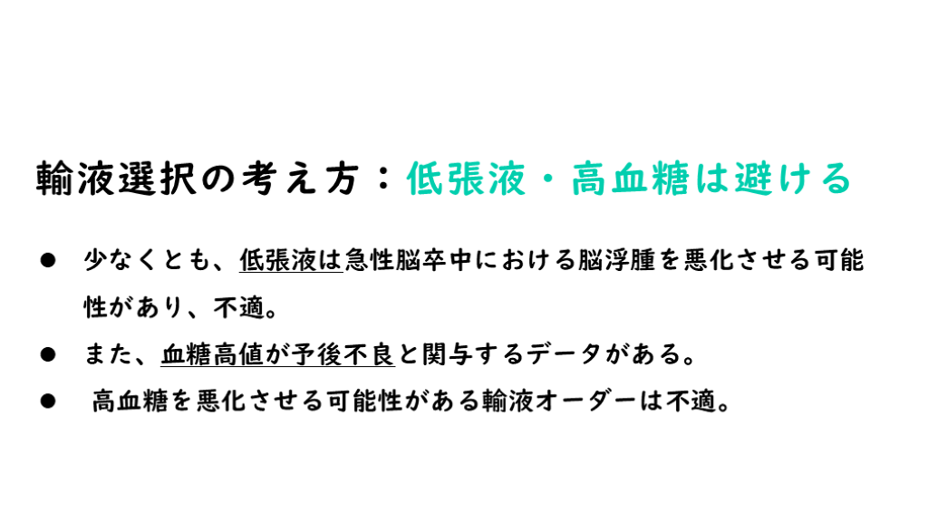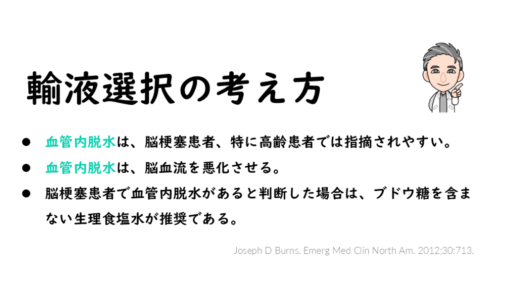 脳梗塞患者で血管内脱水があると判断した場合は、ブドウ糖を含まない生理食塩水が推奨である。 Joseph D Burns. Emerg Med Clin North Am. 2012;30:713.