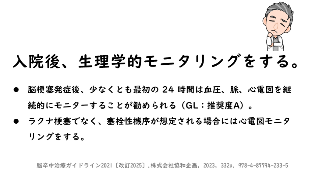 #133. 入院後、生理学的モニタリングをする。 脳梗塞発症後、少なくとも最初の 24 時間は血圧、脈、心電図を継続的にモニターすることが勧められる(GL:推奨度A)。