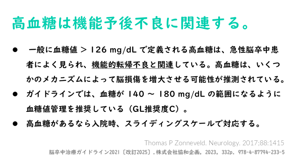 高血糖があるなら入院時、スライディングスケールで対応する。 Thomas P Zonneveld. Neurology. 2017;88:1415 脳卒中治療ガイドライン2021〔改訂2025〕.株式会社協和企画, 2023, 332p. 978-4-87794-233-5