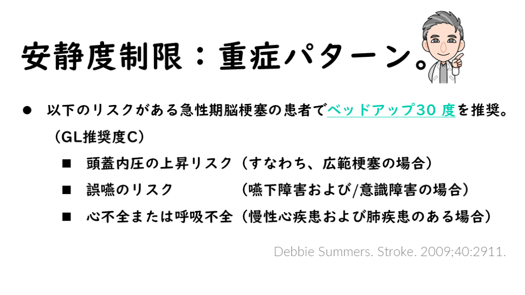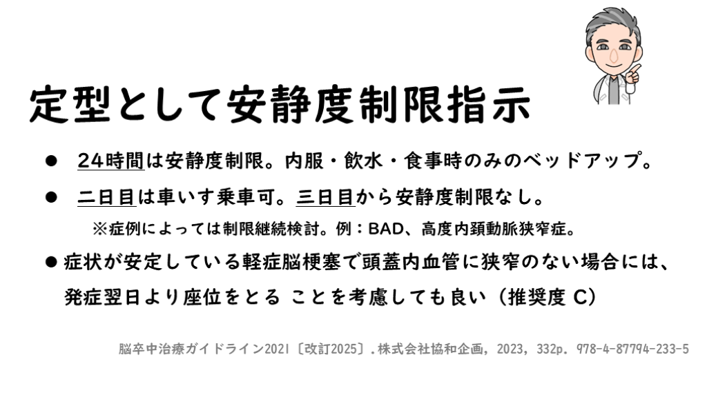 症状が安定している軽症脳梗塞で頭蓋内血管に狭窄のない場合には、発症翌日より座位をとる ことを考慮しても良い(推奨度 C)
