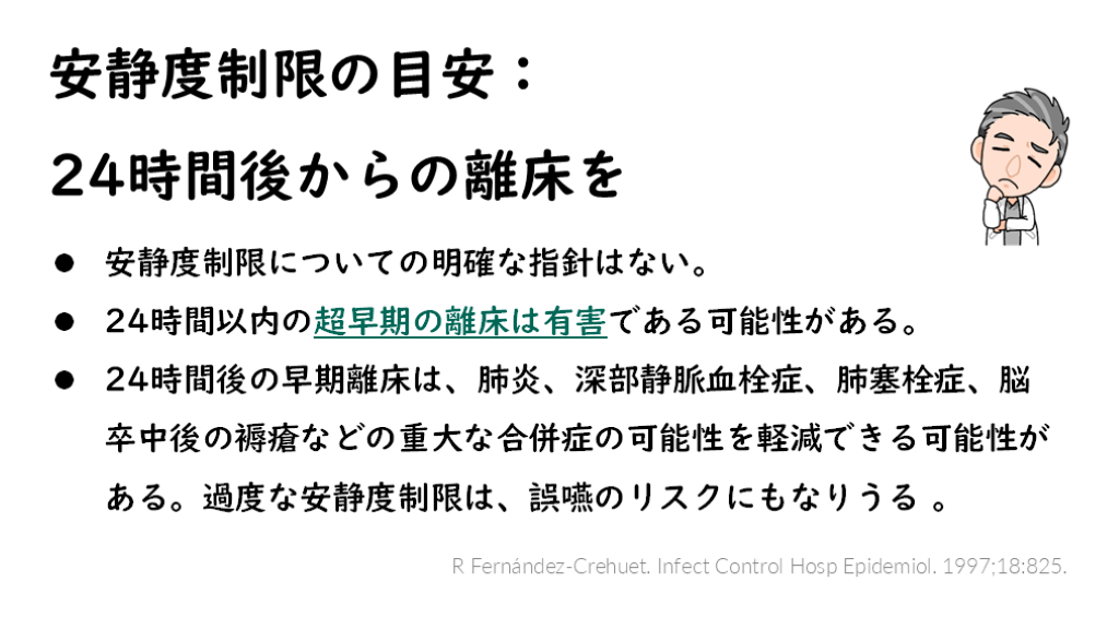 24時間後の早期離床は、肺炎、深部静脈血栓症、肺塞栓症、脳卒中後の褥瘡などの重大な合併症の可能性を軽減できる可能性がある。過度な安静度制限は、誤嚥のリスクにもなりうる 。 R Fernández-Crehuet. Infect Control Hosp Epidemiol. 1997;18:825.