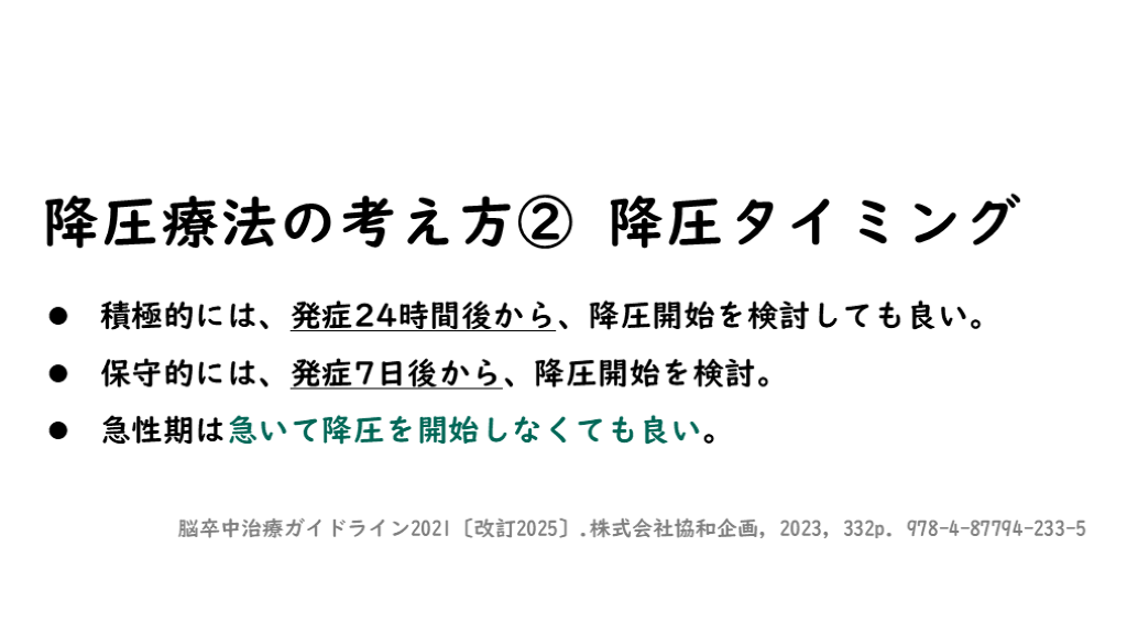 #139. 降圧療法の考え方② 降圧タイミング 積極的には、発症24時間後から、降圧開始を検討しても良い。